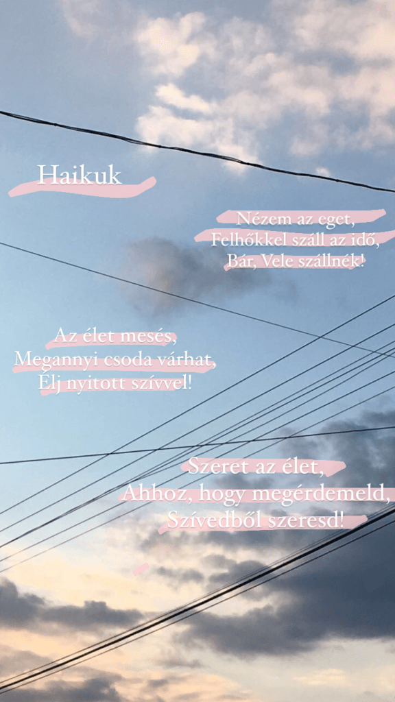 Olyan haikukat válogattam nekik, amelyek különösen képszerűek. Simon Márton Polaroidok című kötetéből is mutattam néhányat. Kértem, hogy válasszanak egyet, s alkossanak hozzá digitális képet, GIF-et, videót, tetszés szerint. (Volt, aki mégis a rajzolást választotta, nem baj.) Természetesen nem egyforma minőségű munkák érkeztek. Mégis bemutatok itt jó néhányat, öröm volt látni a megnyilatkozásaikat. Néhány közöttük egészen kiváló!