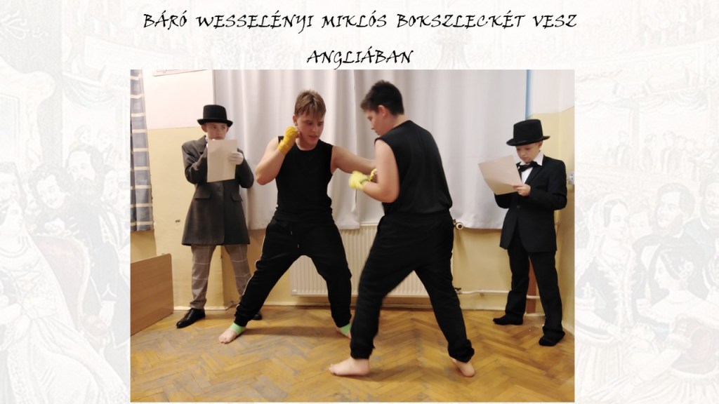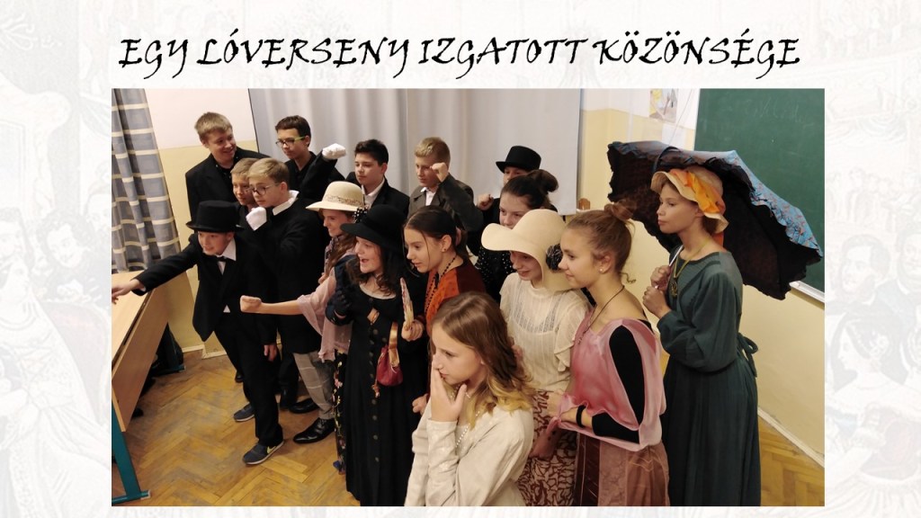 Szintén a projektzárón mutattuk be a reformkori életképeket bemutató ppt-t, amelynek – hagyományainknak megfelelően – korabeli jelmezbe öltözött tanítványaink voltak modelljei. 🙂 Néhány dia ebből: