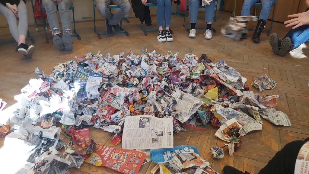 2. Titokzatos mozzanat: most jön az újságpapír! Mindenki kap a kezébe néhányat, és megkérem, hogy tegyék vele azt, amit én: lapokra tépem, összegyűröm, és a papírgombócokat a kör közepére dobálom. Némi csodálkozás után elkezdenek utánozni, ez nagyon jó hangulatú mozzanata a játéknak. 🙂 De még mindig nem tudják, mire jó ez!
