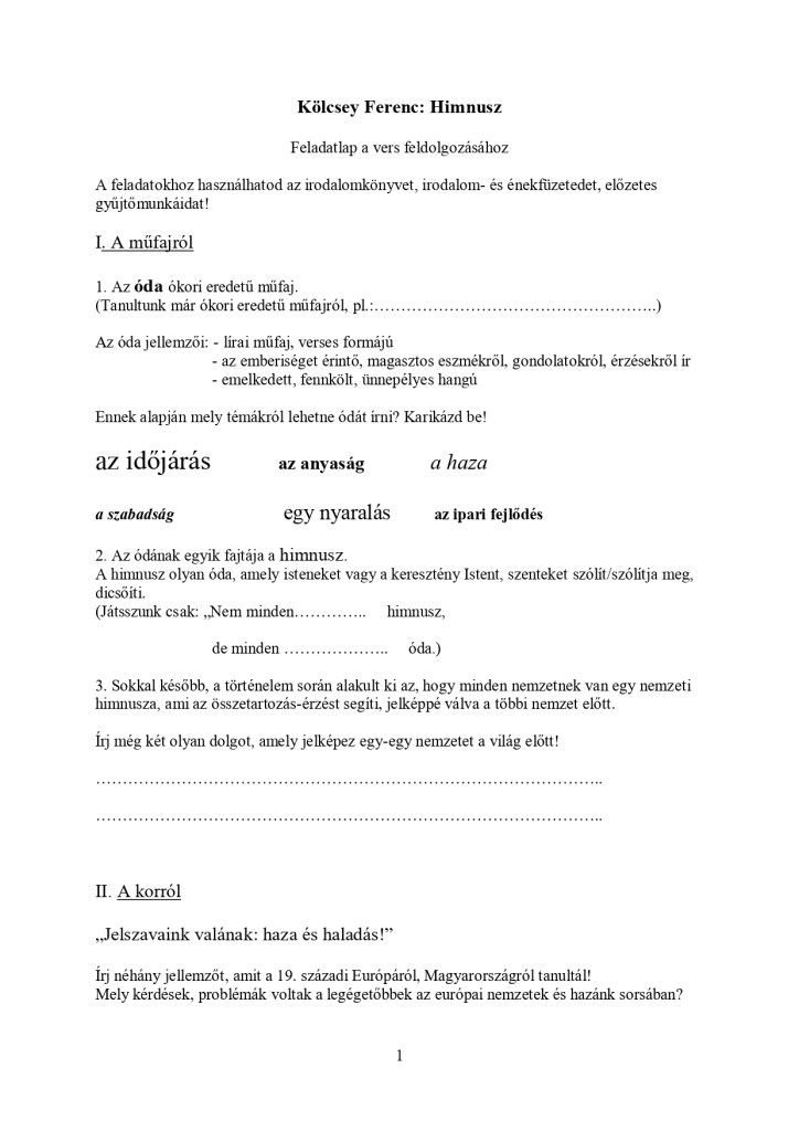 (Fontos kiegészítés: a feldolgozás “klasszikus”, a 7. osztályos gyerekeknek felfogható mélységig elemzi csak a verset. Figyelmen kívül hagyja tehát a napjainkban is folyamatosan megjelenő újabb és újabb, a Himnuszhoz kapcsolódó adalékokat, nézőpontokat.)