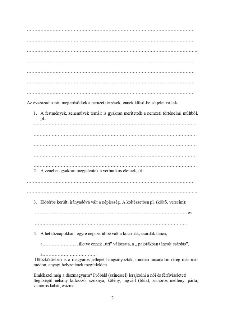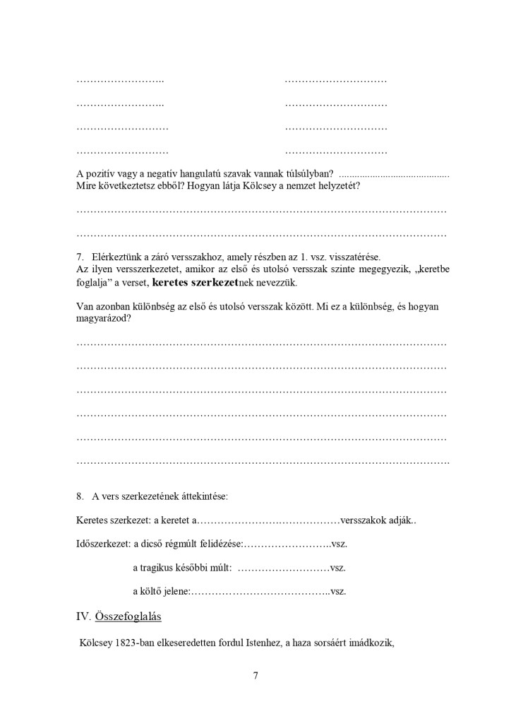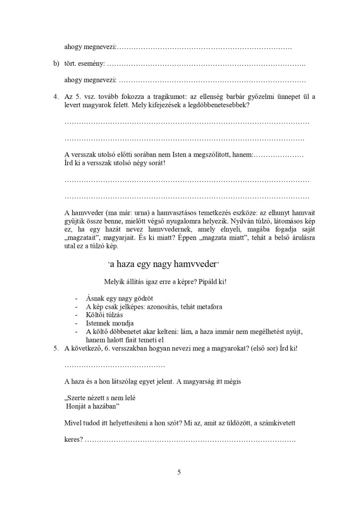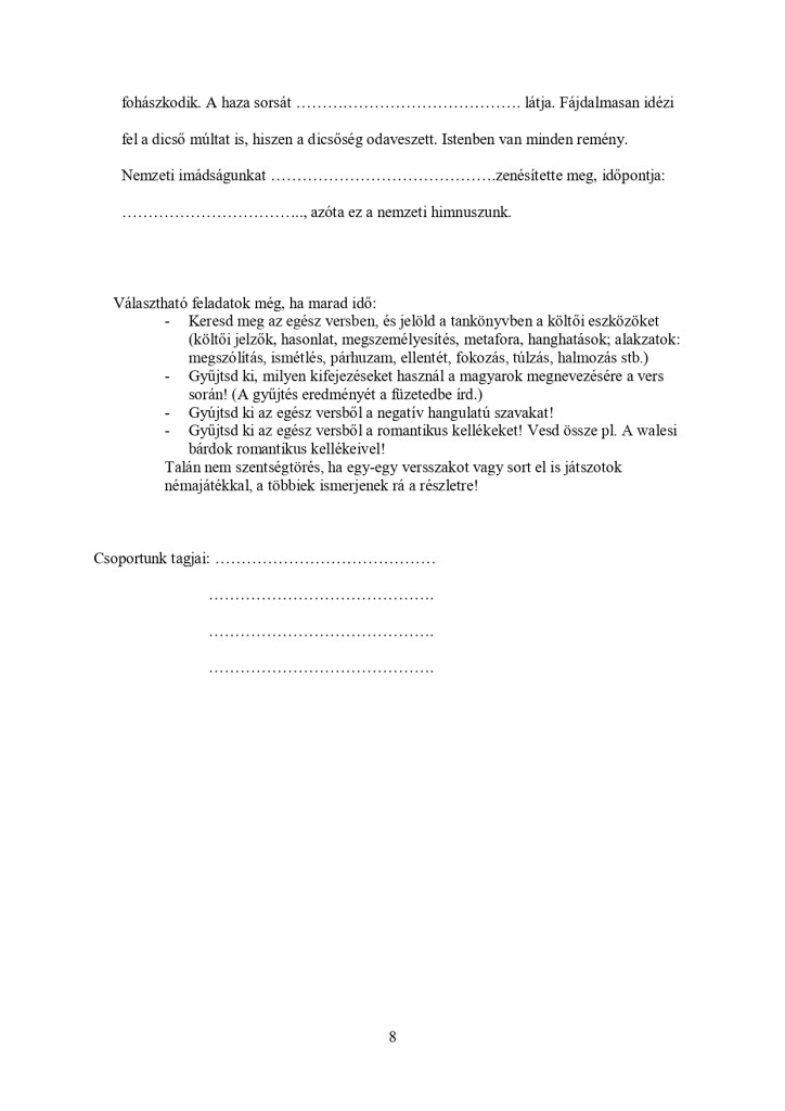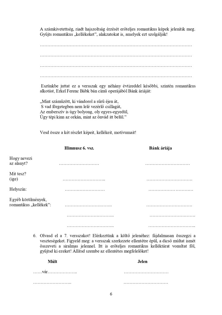 Ennek mintájára – a kíváncsiság kedvéért: vajon boldogulnak-e a gyerekek az én magyarázatom nélkül, pusztán írásbeli útmutatást kapva egy nem könnyű vers feldolgozásával – én is összeállítottam egy ilyen „programozott feladatlapot” valamikor a 2000-es évek elején. Csoportokban dolgoztak a gyerekek; addigra már memoriterként megtanulták a teljes szöveget, megismertük a minden művészeti ágban fellelhető romantikus elemeket, „kellékeket”, részletesen megismerkedtünk Erkel két nagy operájával, megtanultuk táncolni a palotást – tehát nem volt ismeretlen ez a kor művészeti szempontból sem. Az önálló feldolgozást úgy kell érteni, hogy én természetesen jelen voltam, megszólíthattak, kérdezhettek, de csak útmutatást adtam, nem választ.