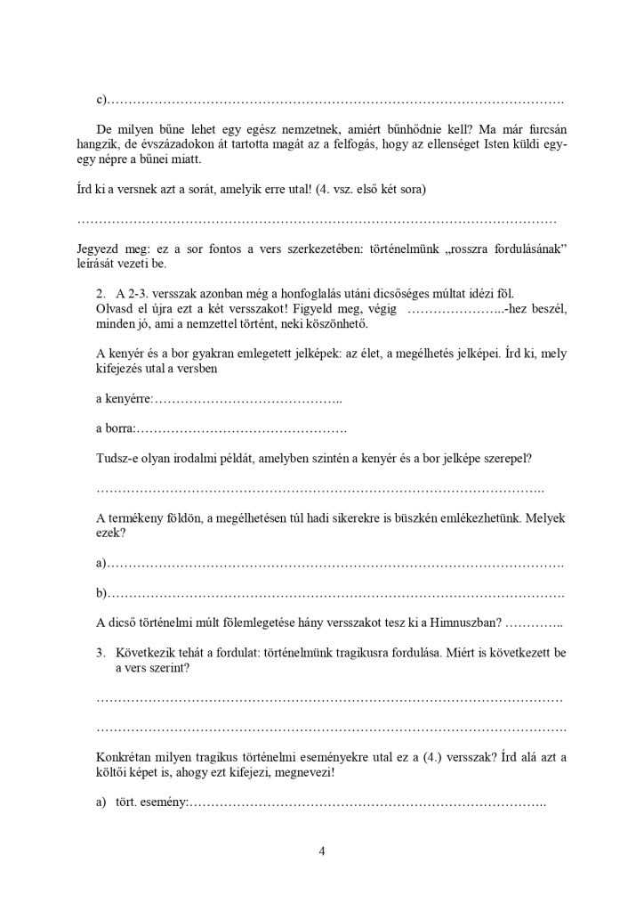 Nos, mint annyiszor, kezdetben ment is a dolog. Amikor évekkel később ismét elővettem ezt a feladatlapot – a dolgok úgy álltak, hogy már megismertük a fentebb említetteket, mire sorra került a Himnusz –, és mit tapasztaltam? A gyerekeknek nem volt türelmük a lépésről lépésre haladáshoz, ide-oda lapozgattak, nem sorrendben, hanem tetszés szerint válaszolgattak a kérdésekre. Márpedig itt előfeltétel a pontos sorrend!